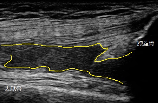 当接骨院での初診時は、深く膝を曲げることができず、患部の圧痛や熱感が著明でした。超音波観察を