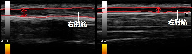 来院時に右橈骨上外側部を押すと激痛が走りました。エコー(超音波)検査を行ったところ、右肘筋が