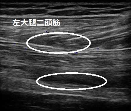 超音波検査では大腿二頭筋と(画像上部の丸)外側広筋(下部の丸)に肉離れと内出血が認められ